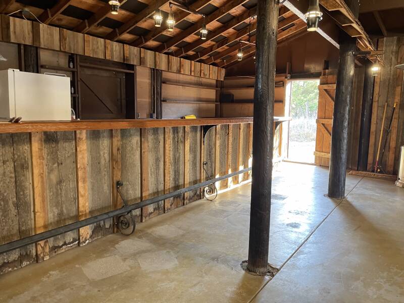 The inside of this beautiful barn. The wagon wheel lights with the bistro lights and greenery really makes it magical when the lights are dim. And all of the windows are closed in the moment but can all be opened as well as the barn doors. The barn can accommodate 200. It does not have heating or AC, only fans. It does not have a kitchen, but does have a regular size fridge, freezer, and cooler in the bar area.